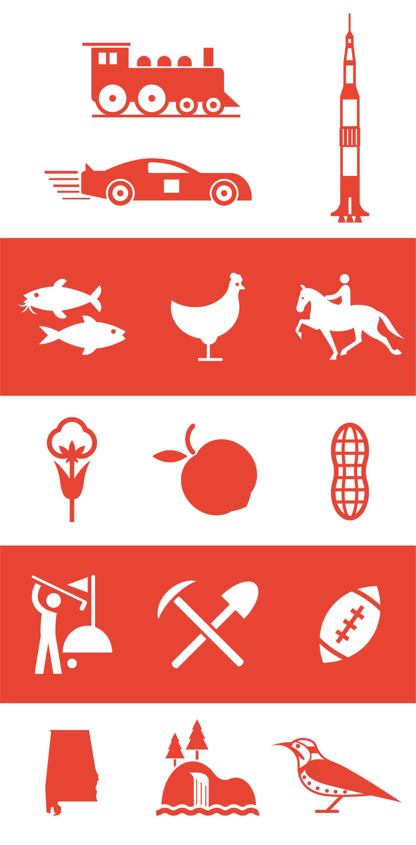 My icon designs for a Google promotion in Oklahoma were a big hit. So when Google opened a branch office in Alabama, I was commissioned to draw a collection of state-themed icons that were used in invitations and promotional material there. The Alabama-themed icons combine with Google brand icons to form a Google Maps pin shape, but they can also stand alone. Some highlights include stock car racing, mining, waterfalls, the state bird, and the development of the Saturn V rocket.